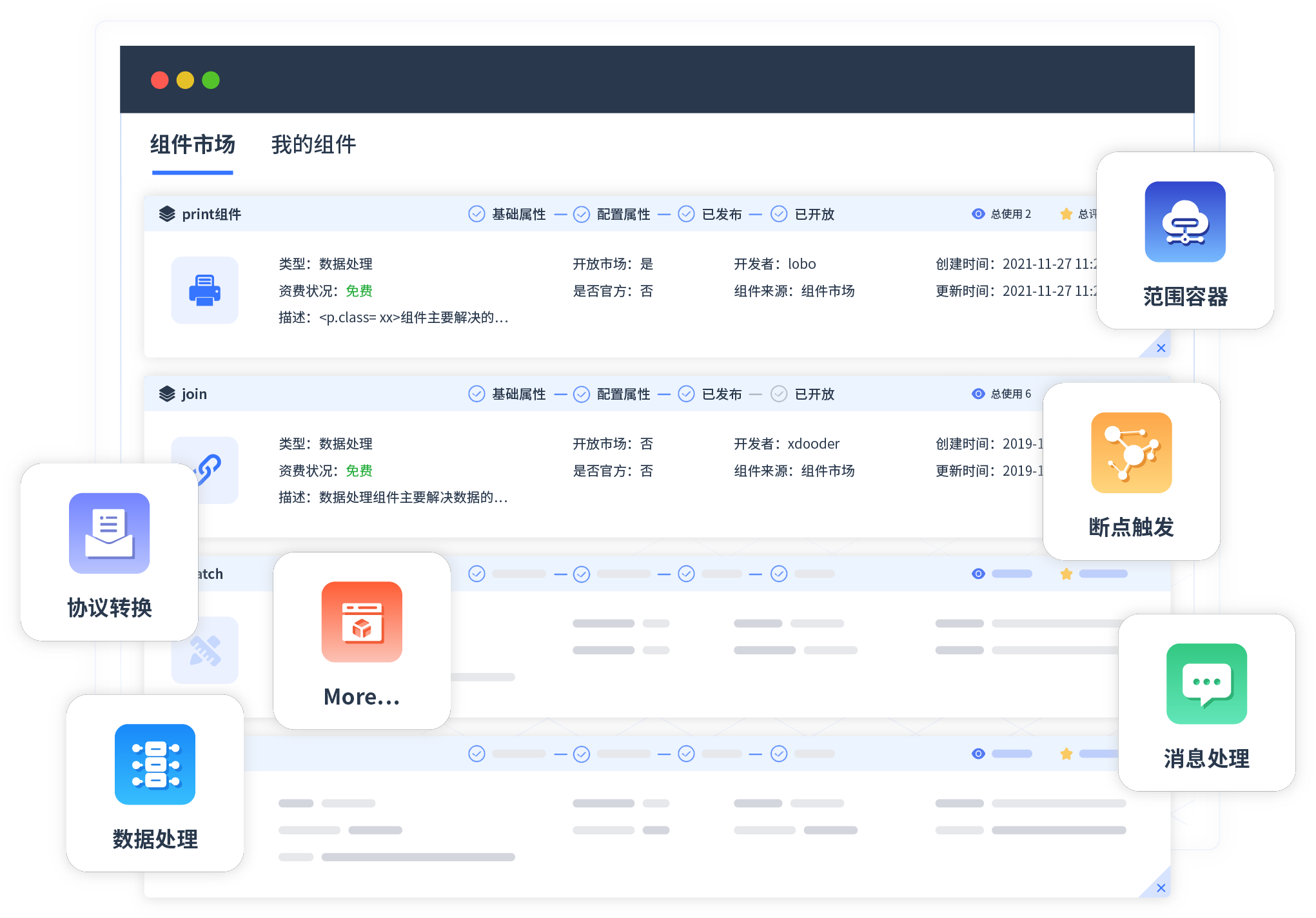 针对集成场景,凯发k8国际首页登录提供组件市场,例如协议转换、消息处理、文件操作等。除平台提供的组件外,客户可以自定义所需组件。