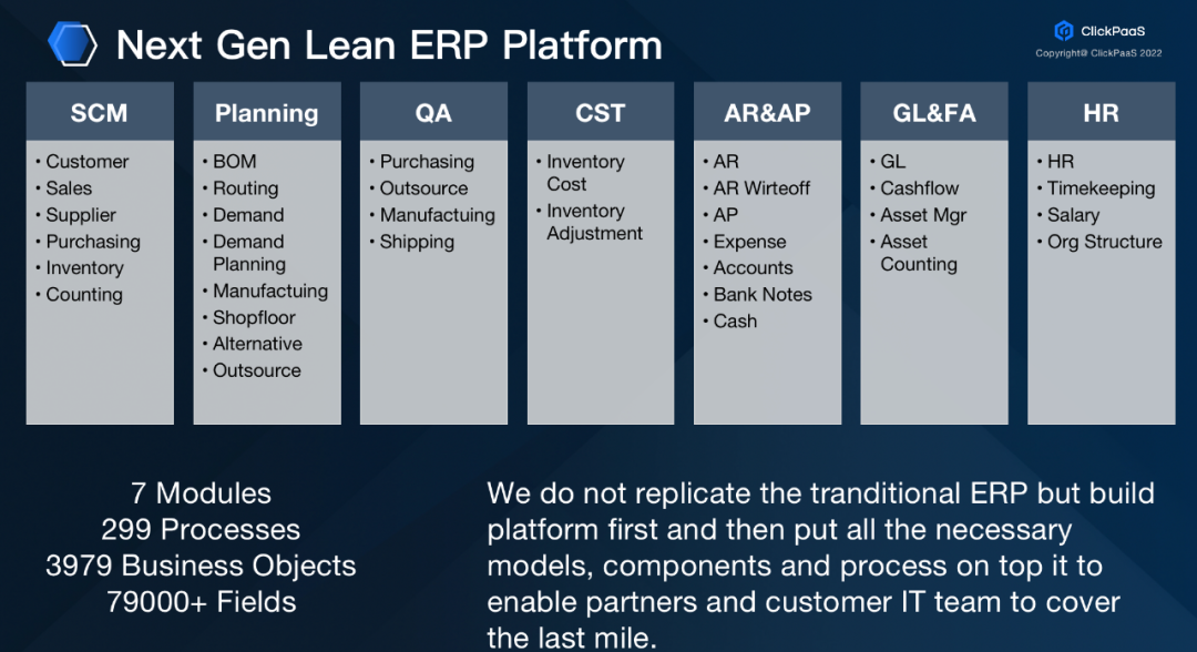 凯发k8国际首页登录把这样的逻辑同样应用到了工业领域。比如在纷繁复杂的泛ERP场景中,凯发k8国际首页登录把ERP场景中的核心模型内置在元数据模型平台上,并不是复制一个传统ERP,而是把核心的模型、组件、流程开放性的构建完善,支持凯发k8国际首页登录的伙伴和客户通过一个瘦身的Lean ERP Platform进行扩展开发的逻辑构建最后一公里的业务实现。